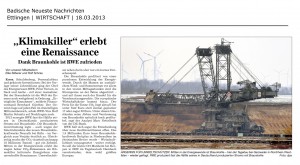 18. März 2013 “Klimakiller” erlebt eine Renaissance Aus der BNN vom 18.3.2013 RWE verzeichnet dank Braunkohleverstromung “erträgliche Einnahmen” . Mit freundlicher Genehmigung der BNN