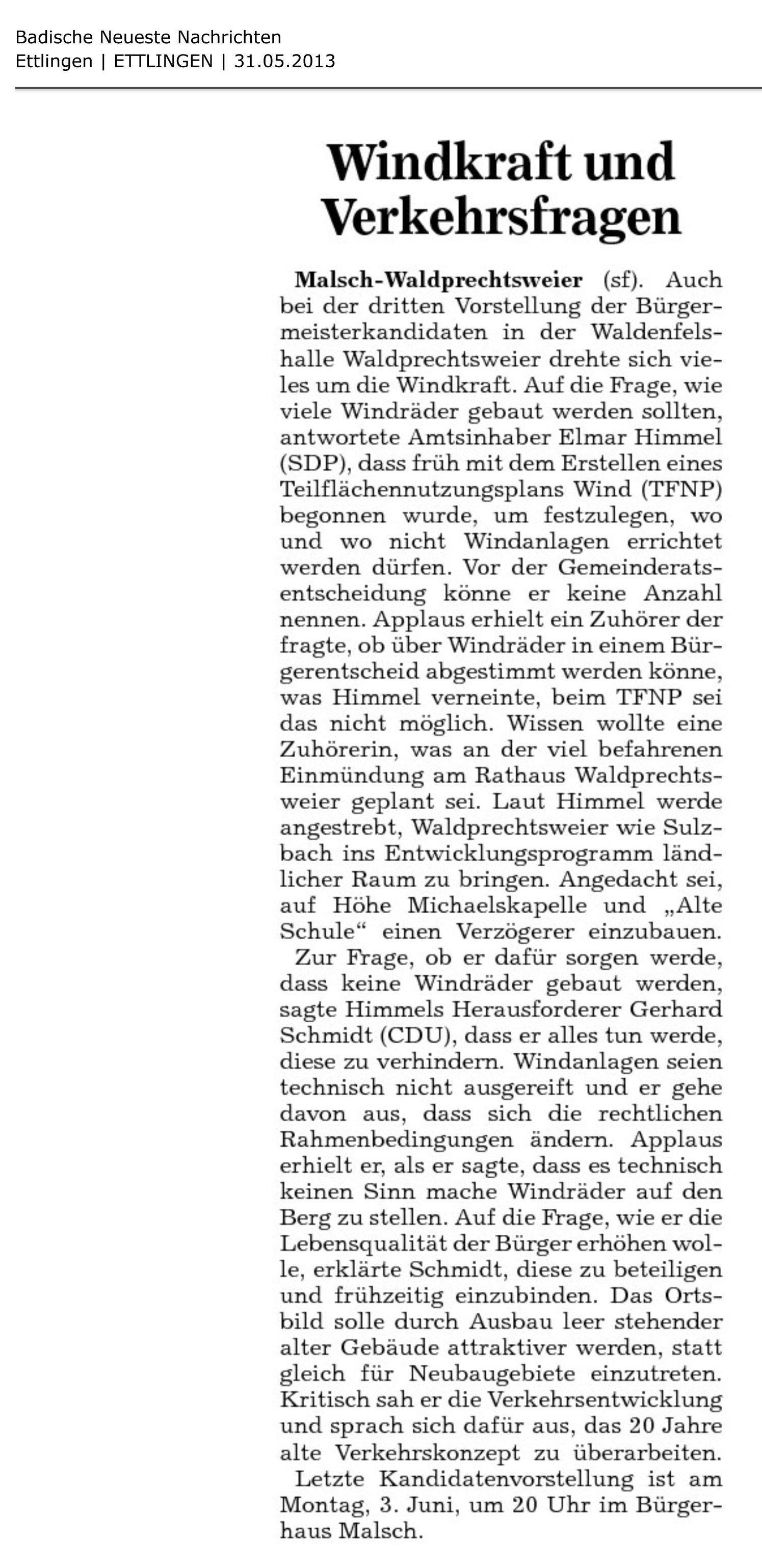 Viele Fragen drehten sich um die geplanten Konzentartionsflächen. BM Himmel wies darauf hin, das früh mit dem Teilflächennutzungsplan Wind begonnen wurde, ein Bürgerentscheid hierzu sei nicht möglich. Gegenkandidat Schmidt will alles tun, um die seiner Meinung nach technisch nicht ausgereiften WKAs zu verhindern.