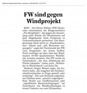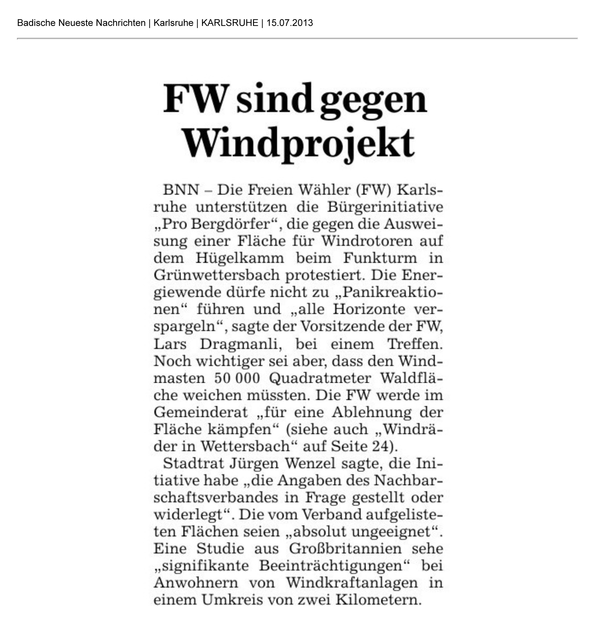 15. Juli 2013 FW sind gegen Windprojekt Aus der BNN vom 15.7.2013 Freie Wähler unterstützen die Initiative “Pro Bergdörfer”: ausgewisene Flächen sind absolut ungeeignet. Mit freundlicher Genehmigung der BNN