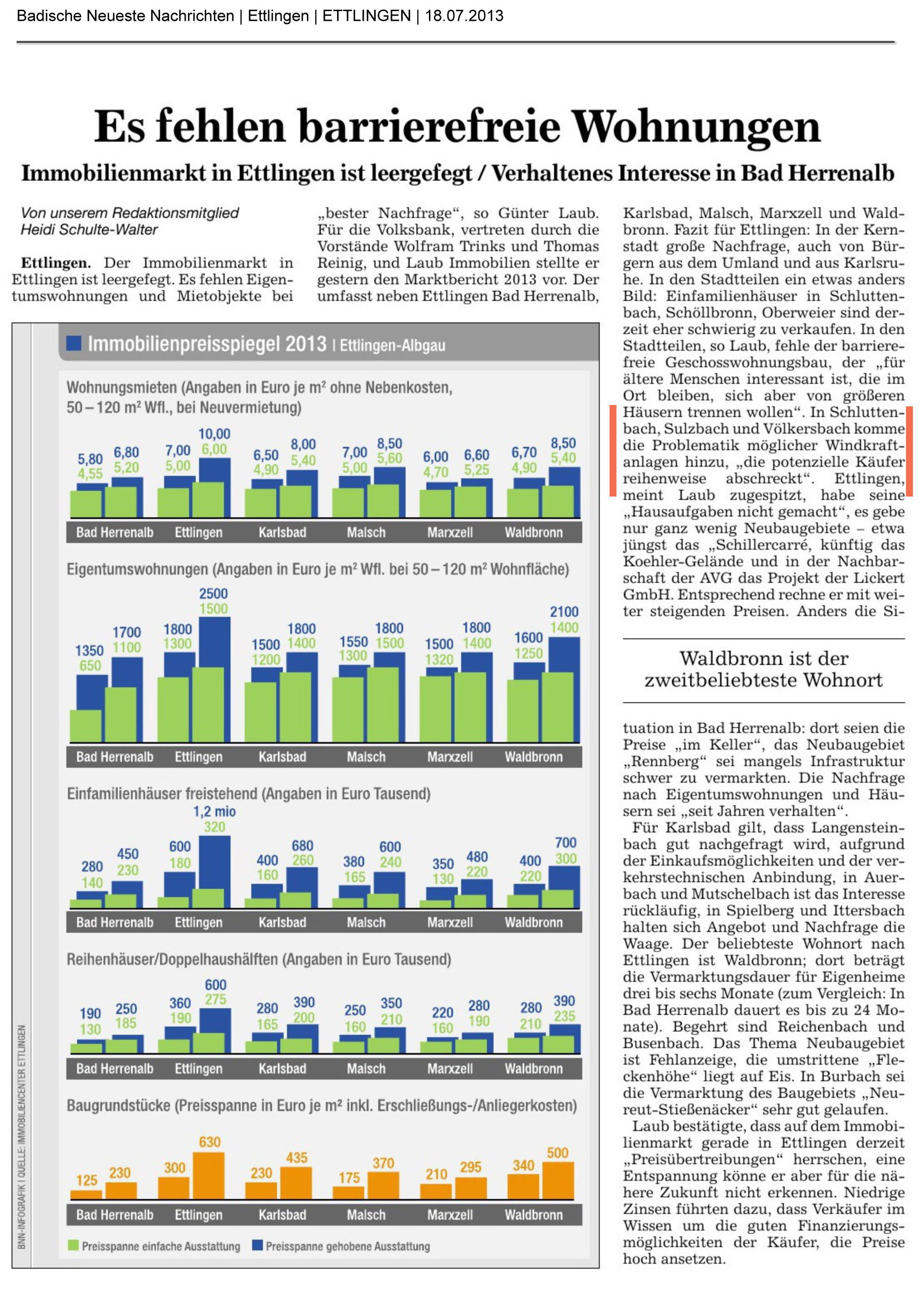 Einfamilienhäuser der Ettlinger Stadtteile Schluttenbach, Sulzbach und Völkersbach sind auf Grund zu erwartender Windkraftanlagen schwieriger zu verkaufen.