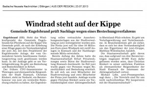 23. Juli 2013 Windrad steht auf der Kippe Aus der BNN vom 23.7.2013 Gemeinde Engelbrand prüft Sachlage wegen Bestechungsverfahren gegen die Fa. juwi AG. Mit freundlicher Genehmigung der BNN