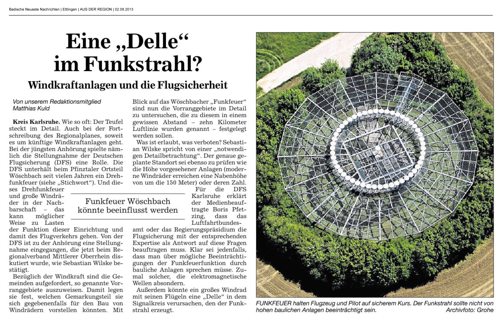 2. August 2013 Eine “Delle” im Funkstrahl? Aus der BNN vom 2.8.2013 Windkraftanlagen könnten sog. Drehfunkfeuer beeinflussen, so das die Flugsicherheit gefährdet ist. Untersuchungen stehen aus. Mit freundlicher Genehmigung der BNN