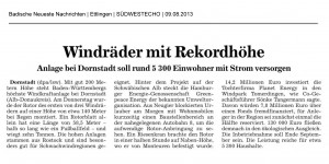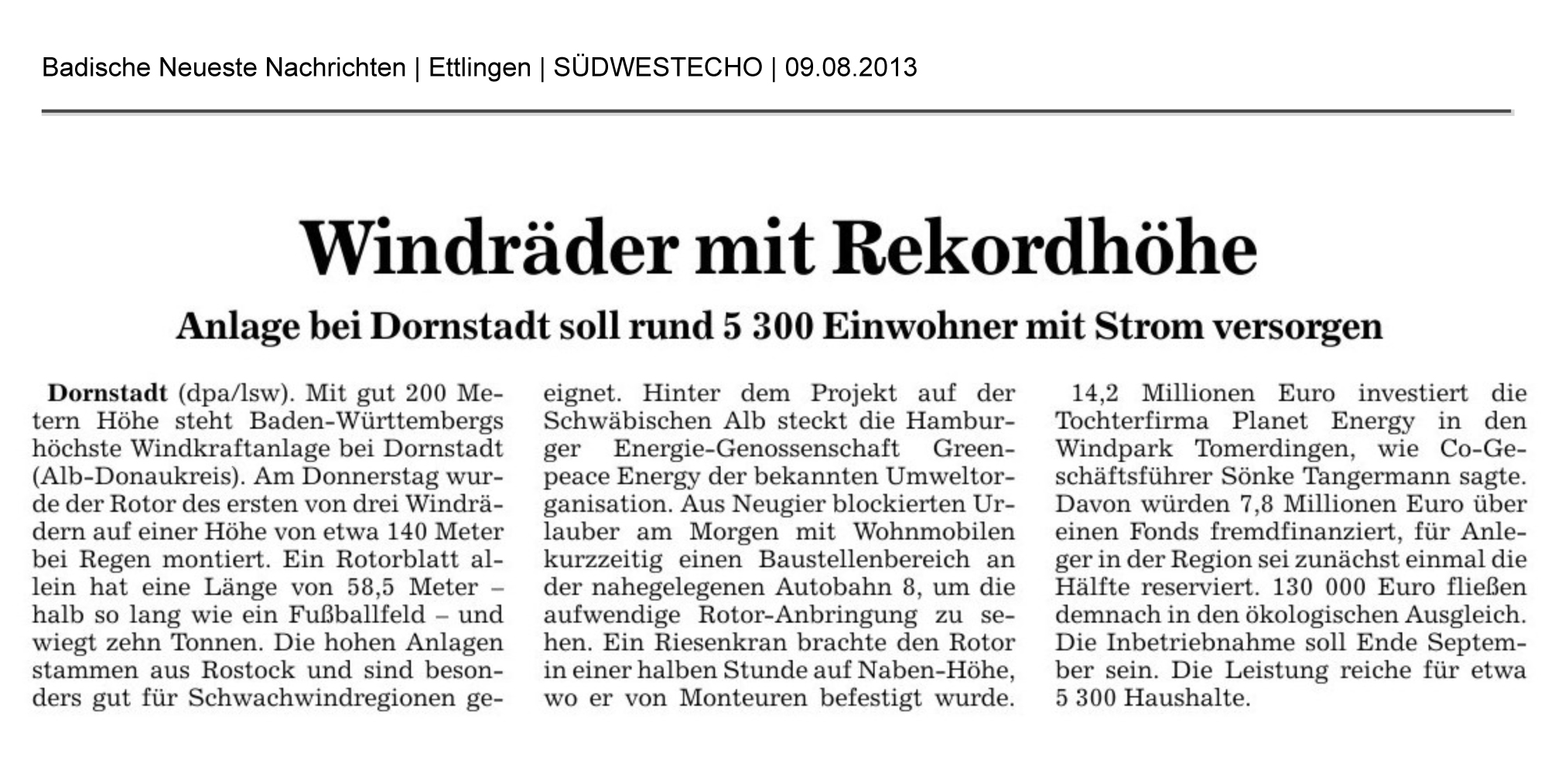 Eine gut 200 Meter hohe Anlage bei Dornstadt soll 5300 Einwohner mit Strom versorgen. Träger ist die Energie-Genossenschaft Greenpeace Energy der gleichlautenden Umweltorganisation.