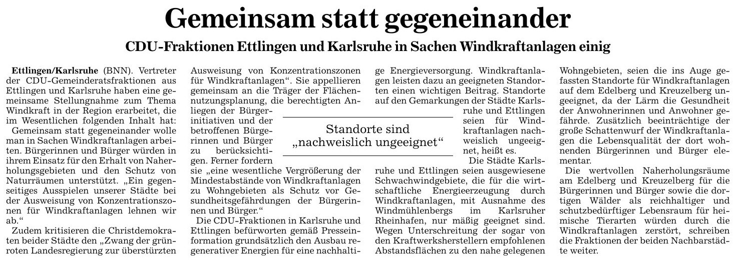 Die CDU-Fraktionen von Ettlingen und Karlsruhe wollen gemeinsam die Bürger, die sich für Naturräume einsetzen unterstützen. Die Fraktionen bemängeln die überstürzte Ausweisung geeigneter Flächen. Schwachwindgebiete wie in unserer Region seien für WKAs ungeeignet, die Beachtung gesundheitlicher Aspekte wird gefordert.