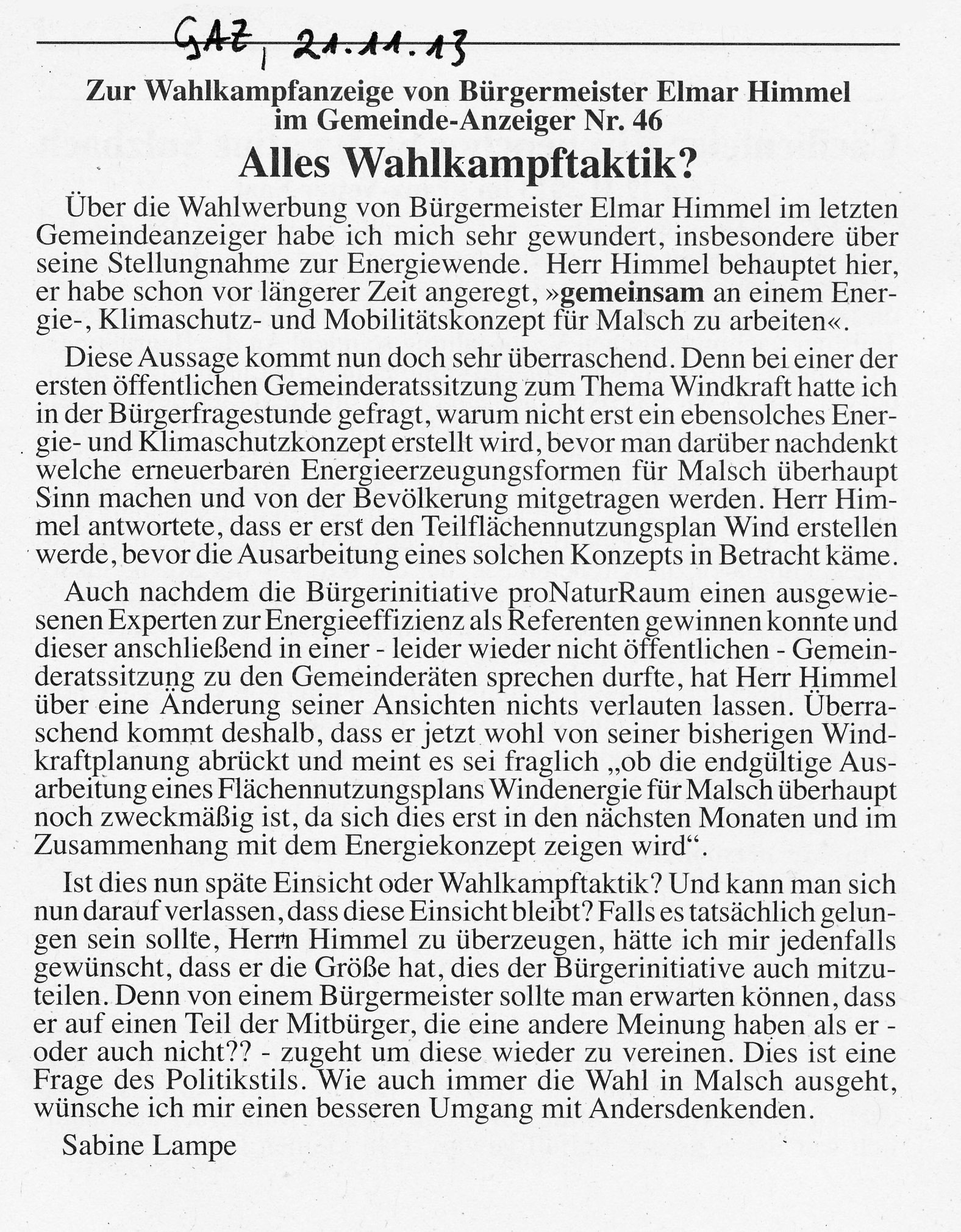 24. November 2013 Alles Wahlkampftaktik? Zur Wahlkampfanzeige von Bürgermeister Elmar Himmel im Gemeinde-Anzeiger Nr. 46 Über die Wahlwerbung von Bürgermeister Elmar Himmel im letzten Gemeindeanzeiger habe ich mich sehr gewundert –> mehr