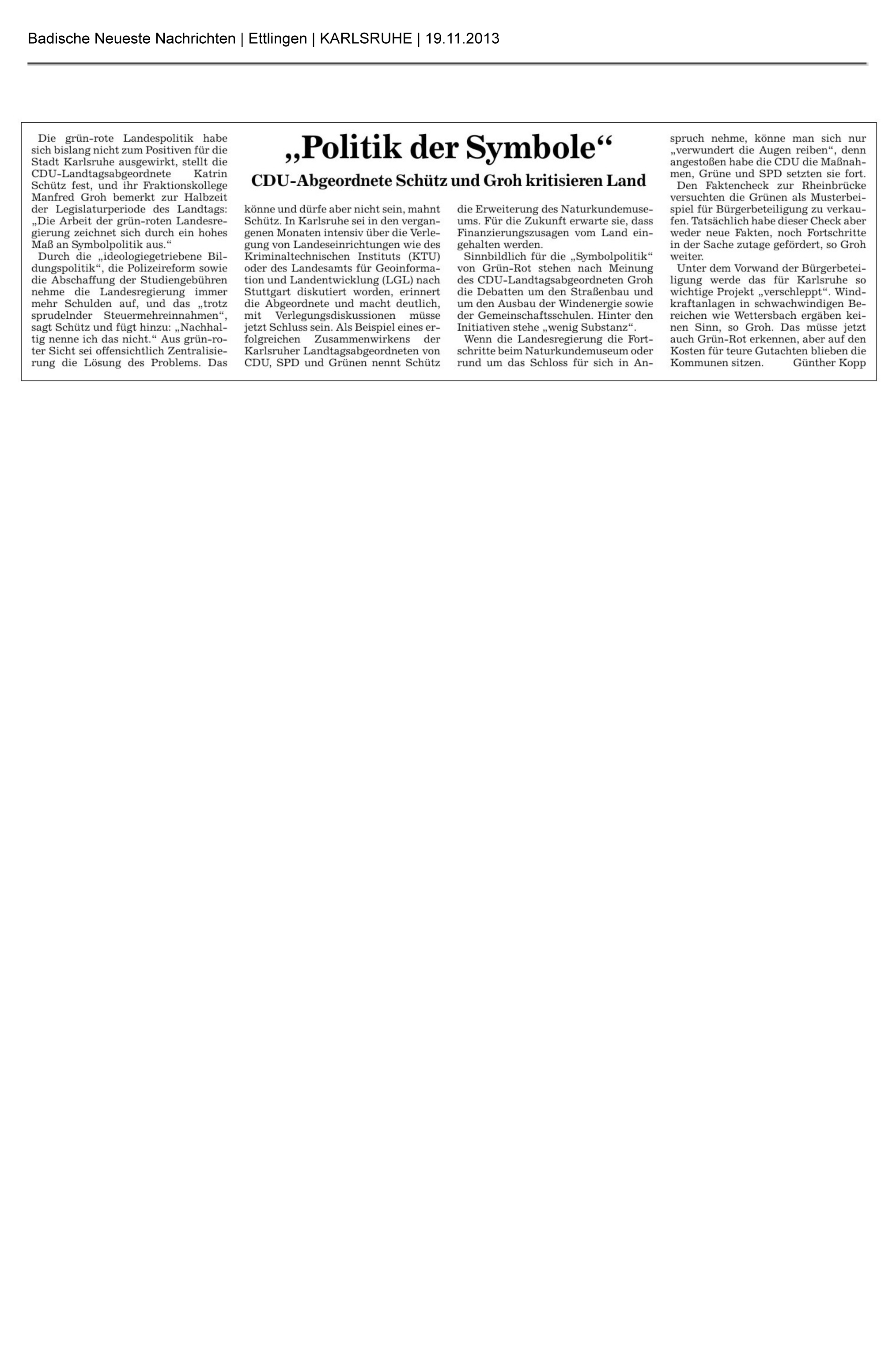 24. November 2013 Politik der Symbole CDU-Abgeordnete Schütz und Groh kritisieren Land Die grün-rote Landesregierung habe sich bislang nicht zum Positiven für die Stadt Karlsruhe ausgewirkt –> mehr Mit freundlicher Genehmigung der BNN