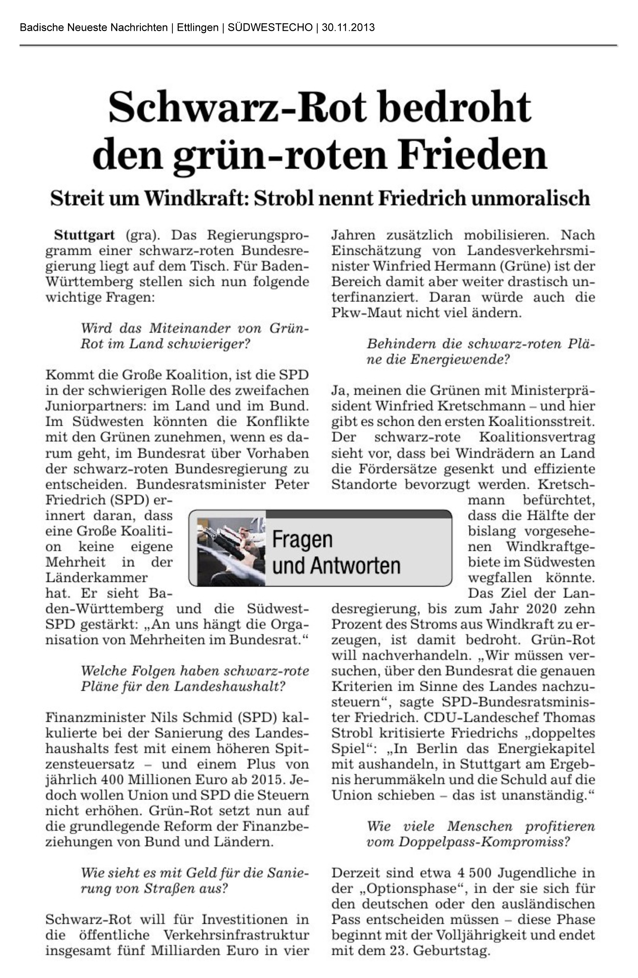 5. Dezember 2013 Schwarz-Rot bedroht den grün-roten Frieden Streit um Windkraft: Strobel nennt Friedrich unmoralisch –> mehr Mit freundlicher Genehmigung der BNN