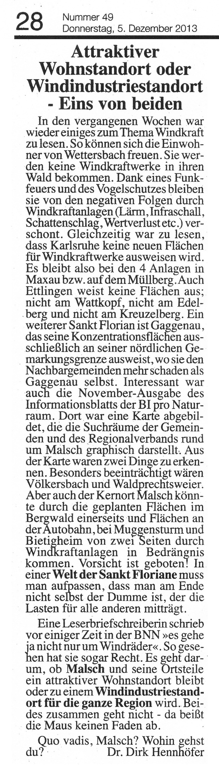 8. Dezember 2013 Attraktiver Wohnstandort oder Windindustriestandort – Eins von beiden In den vergangenen Wochen war wieder einiges zum Thema Windkraft zu lesen. –>mehr