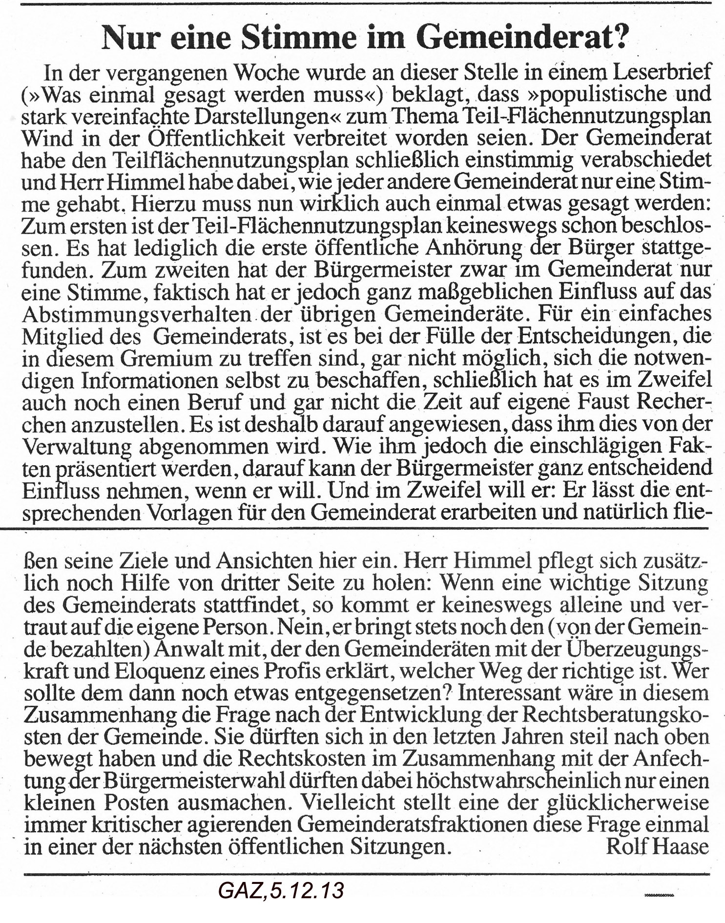 8. Dezember 2013 Nur eine Stimme im Gemeinderat? In der vergangenen Woche wurde an dieser Stelle in einem Leserbrief (Was einmal gesagt werden muss) beklagt, dass populistische … –>mehr