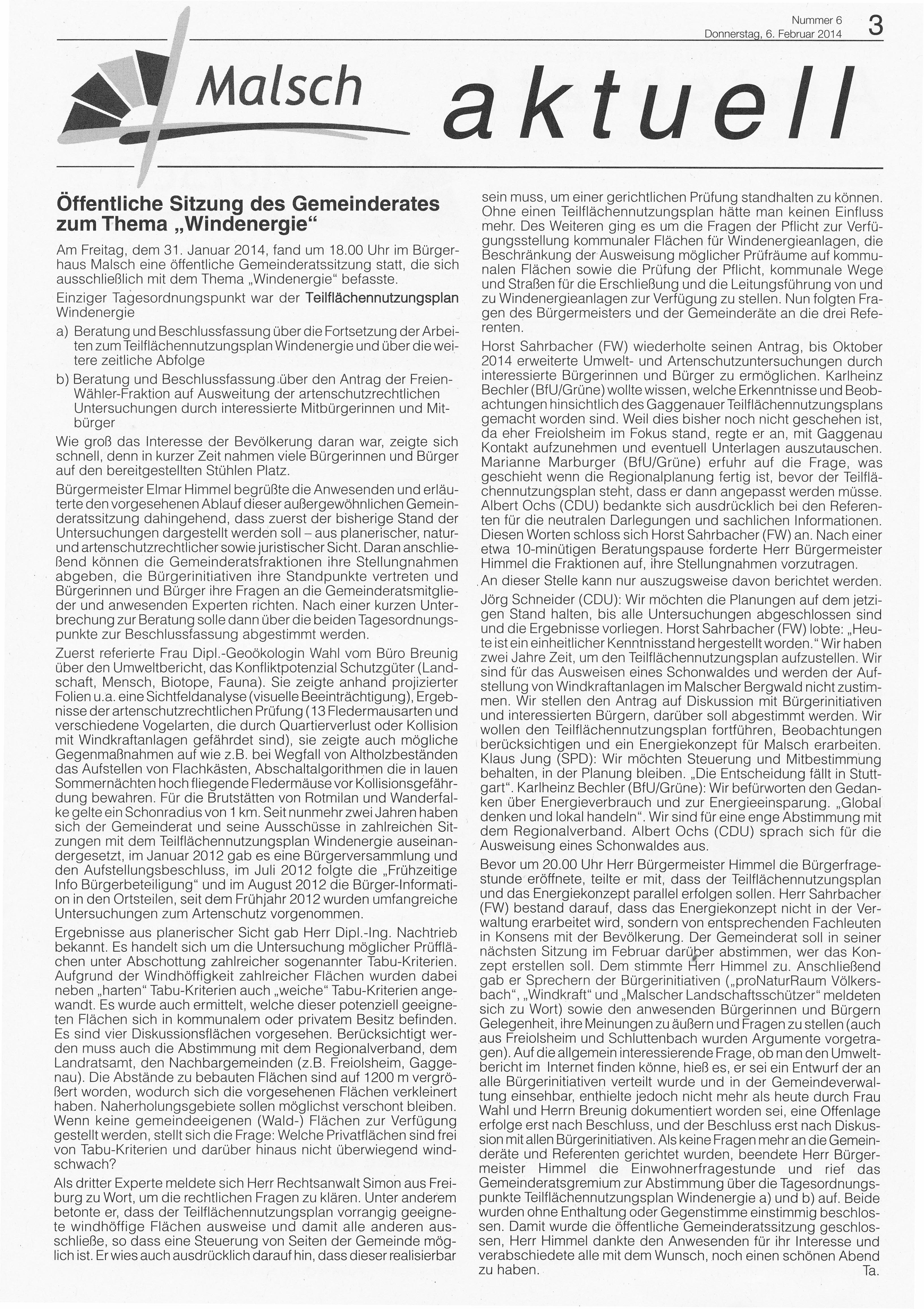 6. Februar 2014 Öffentliche Sitzung des Gemeinderates zum Thema “Windenergie” Am Freitag, dem 31.Januar 2014, fand um 18 Uhr im Bügerhaus Malsch eine öffentliche Gemeinderatssitzung statt, die sich ausschließlich mit dem Thema “Windenergie” befasste. Einziger Tagesordnungspunkt war der Teilflächennutzungsplan Windenergie……..>mehr Aus dem GAZ vom 6.2.2014