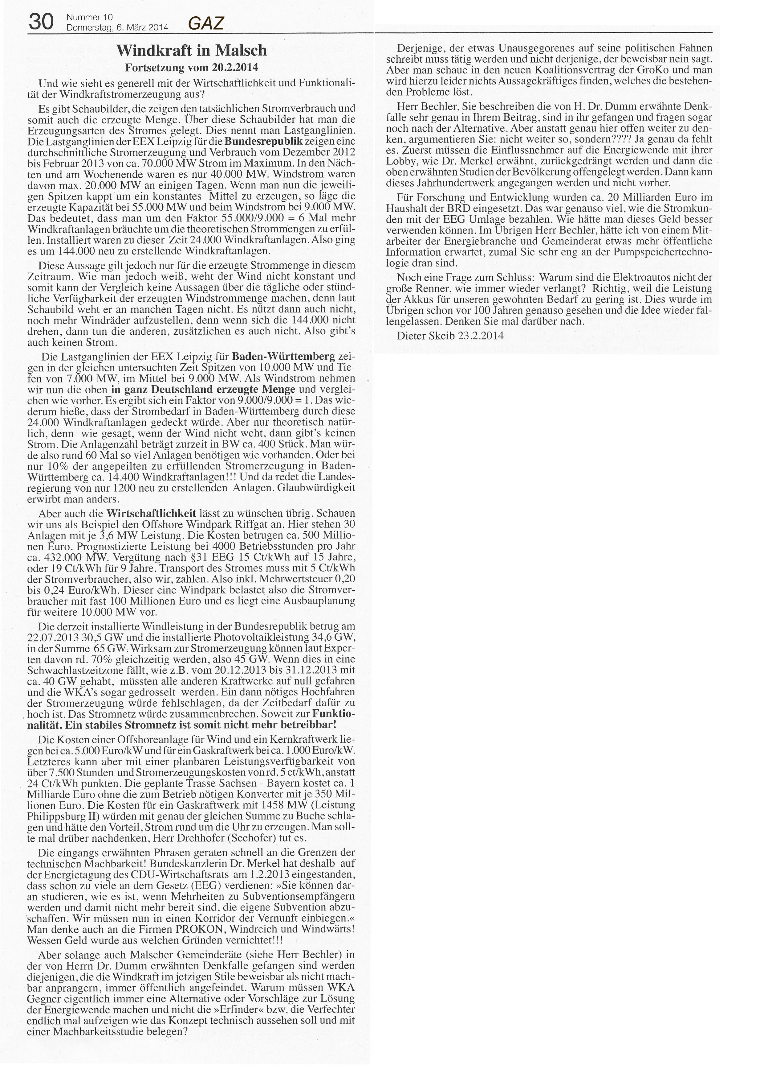 6. März 2014 Windkraft in Malsch Fortsetzung vom 20.2.2014.… Leserbrief von Dieter Skeib Und wie sieht es generell mit der Wirtschaftlichkeit und Funktionalität der Windkrafterzeugung aus?……….>mehr