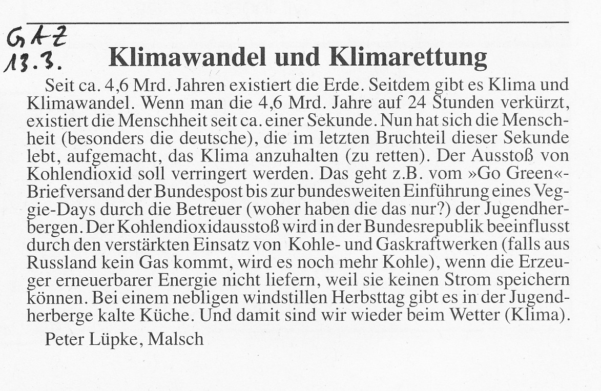 13. März 2014 Klimawandel und Klimarettung Leserbrief von Peter Lüpke, Malsch………>mehr Aus dem GAZ vom 13.3.2014