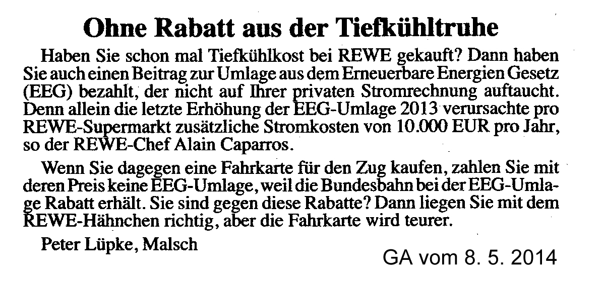 “EEG-Umlage, egal wo erhoben – der Endverbraucher zahlt immer”….Leserbrief von Peter Lüpke………>mehr