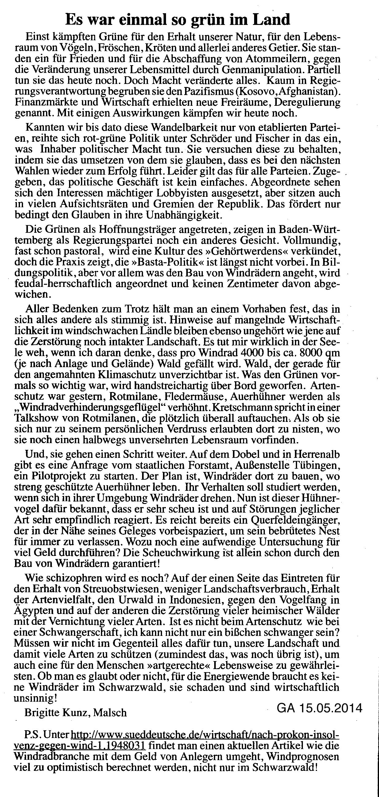 15. Mai 2014 Es war einmal so grün im Land Leserbrief von Brigitte Kunz……..>mehr Aus dem GAZ vom 15.5.2014