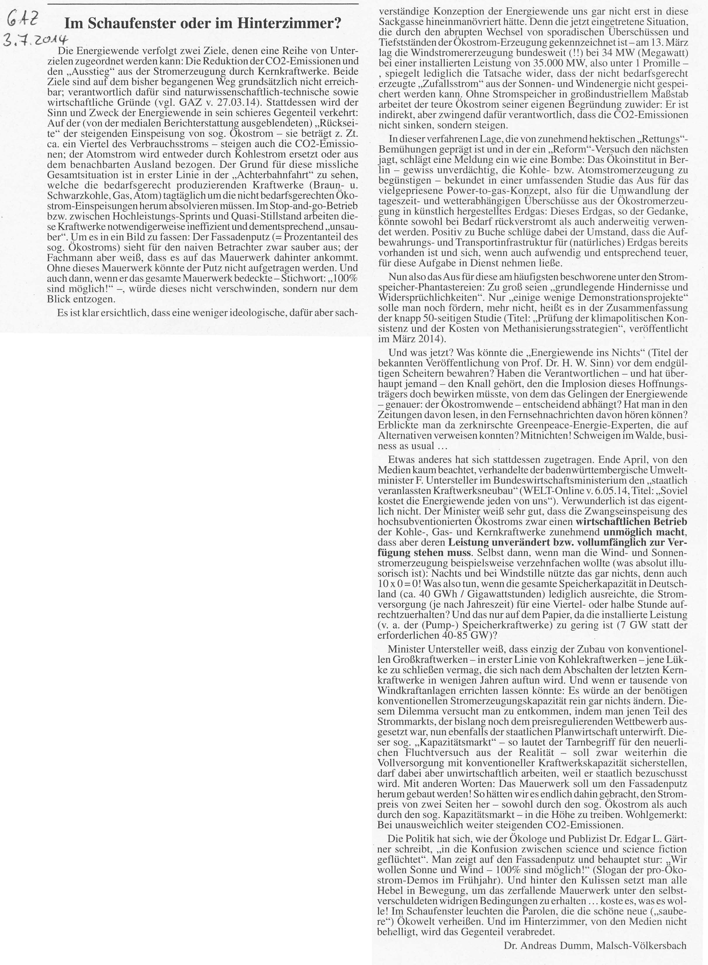 3. Juli 2014 Im Schaufenster oder im Hinterzimmer? Leserbrief von Dr. Andreas Dumm, Malsch-Völkersbach…….>mehr Aus dem GAZ vom 3.7.2014