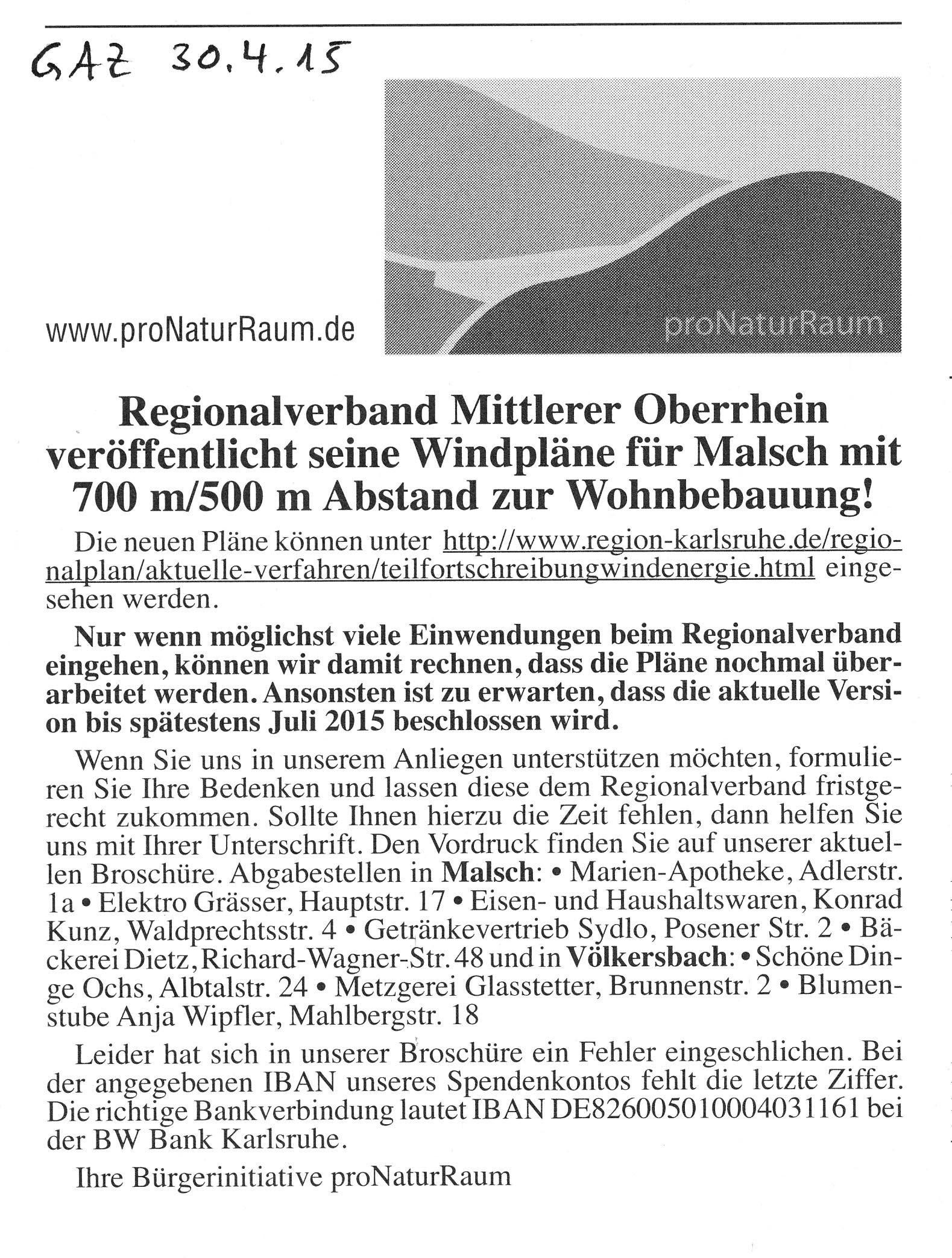 30. April 2015 Regionalverband Mittlerer Oberrhein veröffentlicht seine Windpläne für Malsch mit 700 m/500 m Abstand zur Wohnbebauung! Aus dem GAZ vom 30.4.2015