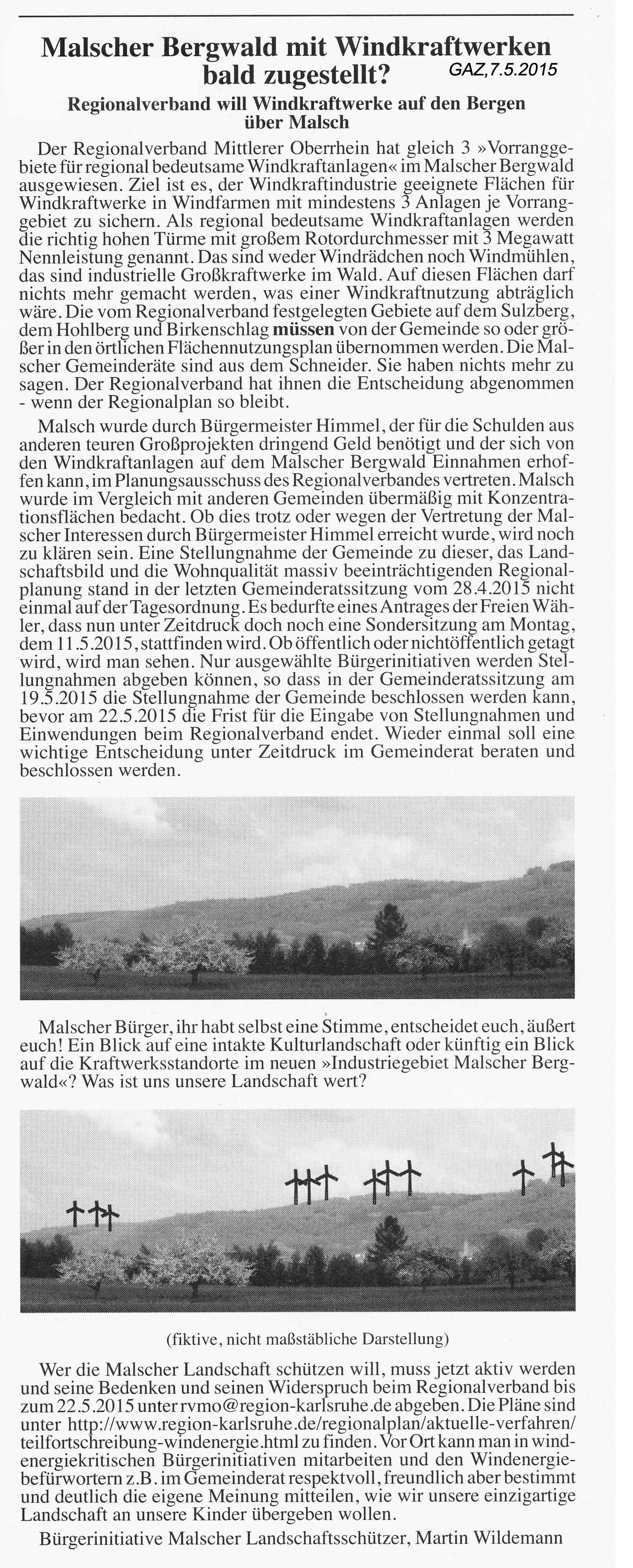 7. Mai 2015 Malscher Bergwald mit Windkraftwerken bald zugestellt? Regionalverband will Windkraftwerke auf den Bergen über Malsch- Leserbrief von Martin Wildemann, Bürgerinitiative Malscher Landschaftsschützer Aus dem GAZ vom 7.5.2015