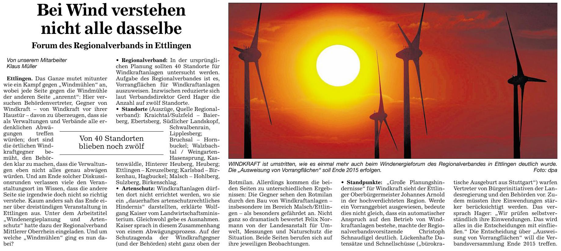 • Standpunkte: „Große Planungshindernisse“ für Windkraft sieht der Ettlinger Oberbürgermeister Johannes Arnold in der hochverdichteten Region. Werde ein Vorranggebiet ausgewiesen, bedeute dies nicht gleich, dass ein automatischer Anspruch auf den Betrieb von Windkraftanlagen bestehe, machte der Regionalverbandsvorsitzende Christoph Schnaudigel deutlich. Lückenhafte Datensätze und Schnellschüsse („bürokratische Ausgeburt aus Stuttgart“) warfen Vertreter von Bürgerinitiativen der Landesregierung und den Behörden vor. Zudem müssten ihre Einwendungen stärker berücksichtigt werden. Das versprach Hager: „Wir prüfen selbstverständlich ihre Einwendungen. Das wird alles in die Entscheidungen mit einfließen.“ Die Entscheidung über „Ausweisung von Vorrangflächen“ will die Verbandsversammlung Ende 2015 treffen.