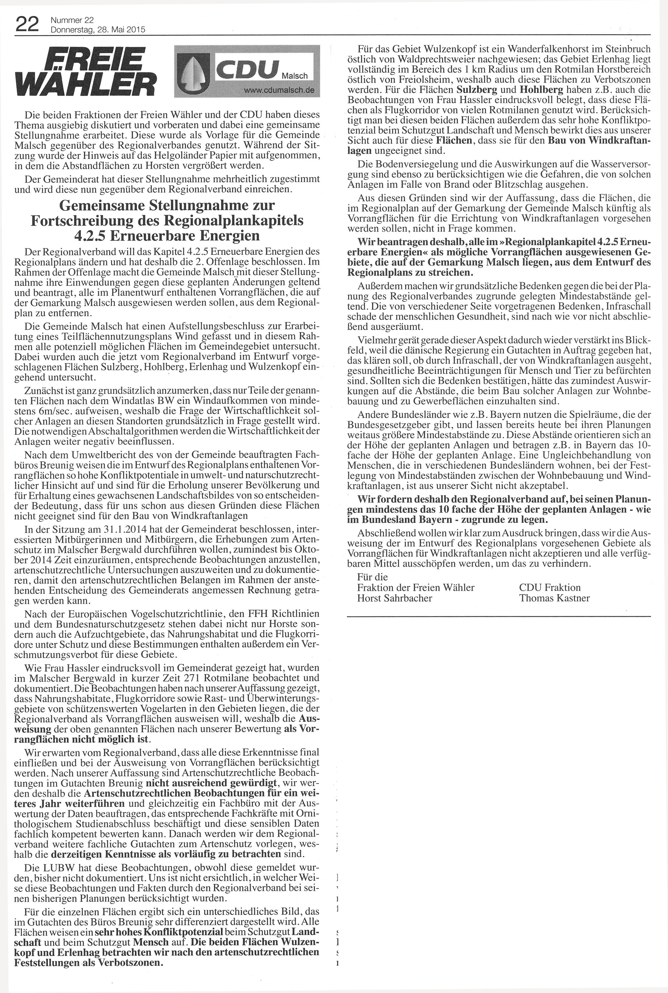 28. Mai 2015 FREIE WÄHLER – CDU Malsch Gemeinsame Stellungnahme zur Fortschreibung des Regionalplankapitels 4.2.5 Erneuerbare Energien Aus dem GAZ vom 28.5.2015