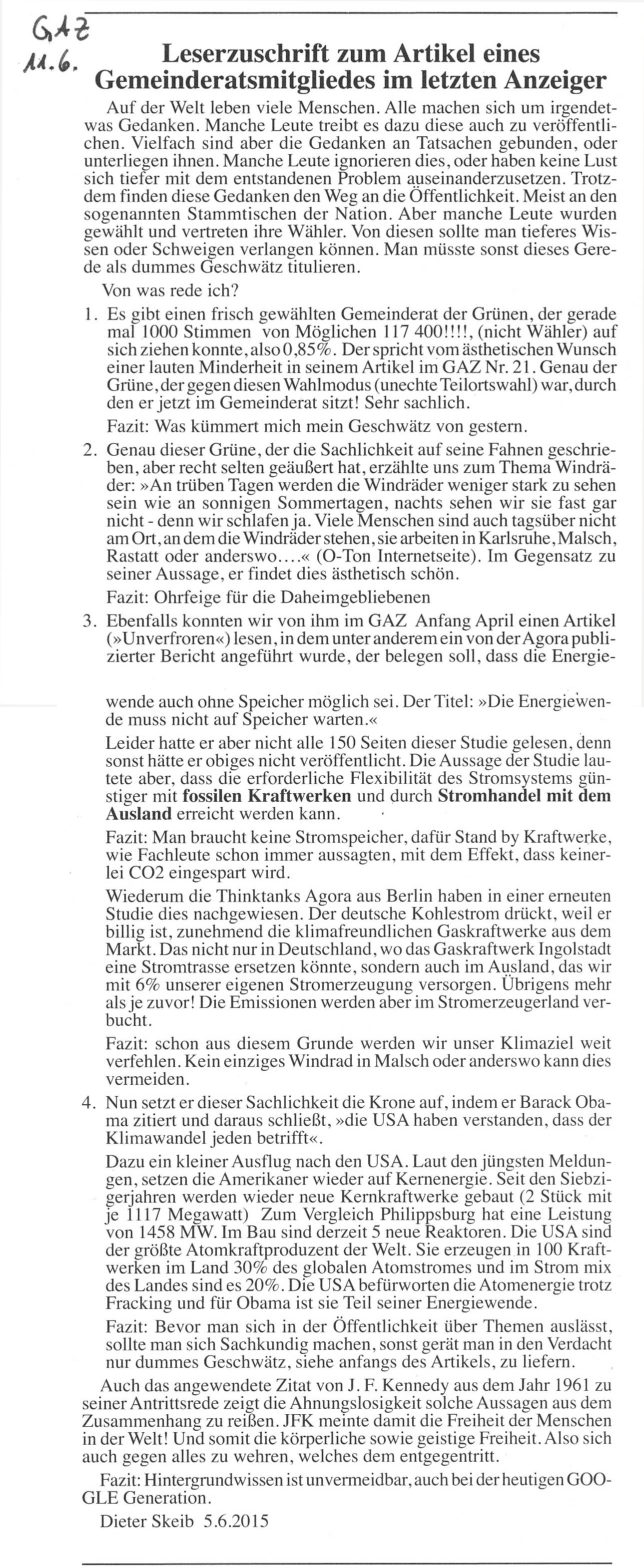 11. Juni 2015 Leserzuschrift zum Artikel eines Gemeinderatsmitgliedes im letzten Anzeiger von Dieter Skeib Aus dem GAZ vom 11.6.2015