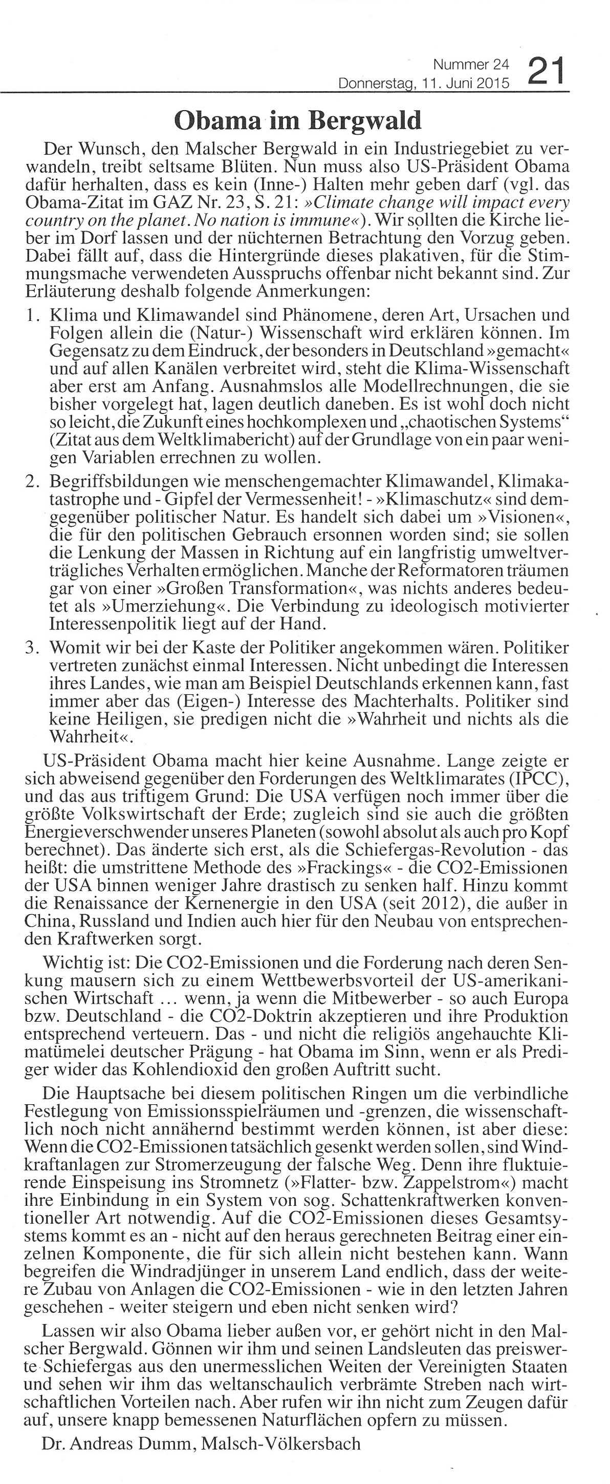 11. Juni 2015 Obama im Bergwald Leserbrief von Dr. Andreas Dumm, Malsch-Völkersbach Aus dem GAZ vom 11.6.2015