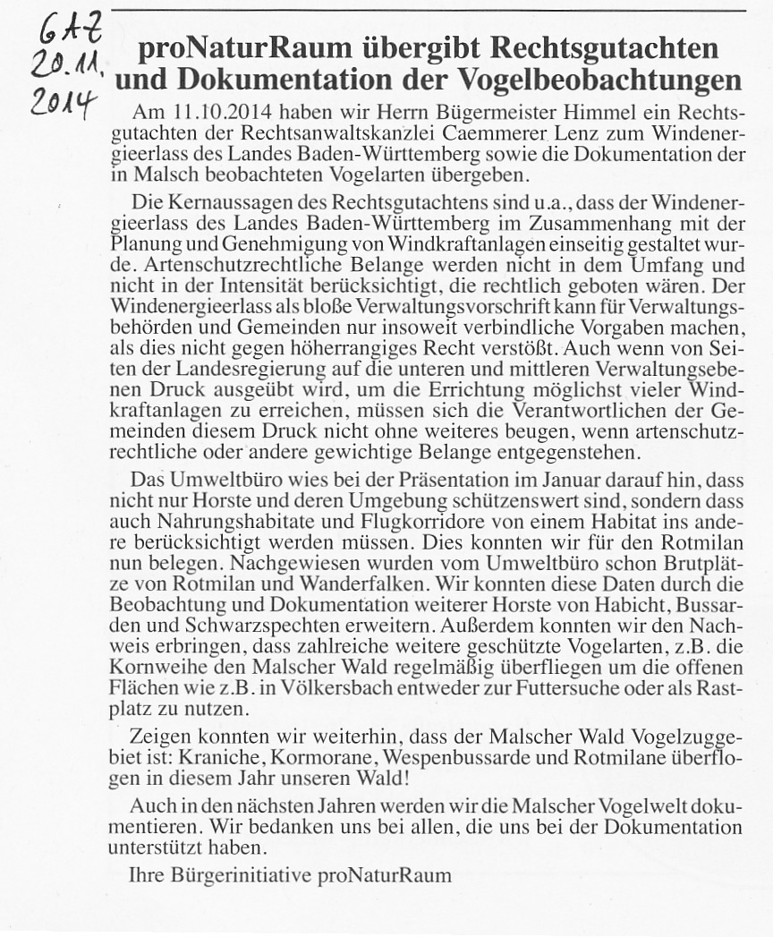 Zur Unterstützung der regionalpolitischen Willensbildung und zur Verbesserung der sachlichen Entscheidungsgrundlagen haben wir zusammen mit anderen Bürgerinitiativen in Baden-Württemberg ein Gutachten von den Rechtsanwälten Caemmerer Lenz erstellen lassen. Darin wird das Verhältnis von europäischem Artenschutz und landesplanerischen Vorgaben im Windenergieerlass des Landes Baden-Württemberg beleuchtet. Im letzten Jahr haben wir zusammen mit den Bürgerinitiativen Gegenwind Ettlingen und Windkraft-Freiolsheim eine eigenständige Beobachtung und Kartierung der Avi-Fauna im Hangbereich zwischen Karlsruhe und Rastatt vorgenommen. Ein Teil dieser umfangreichen Daten wurden Herrn Dr. Hager, Verbanddirektor des Regionalverbandes übergeben. Wir haben angeregt, das von uns erstellte Material in den laufenden Planungsverfahren zu berücksichtigen.
