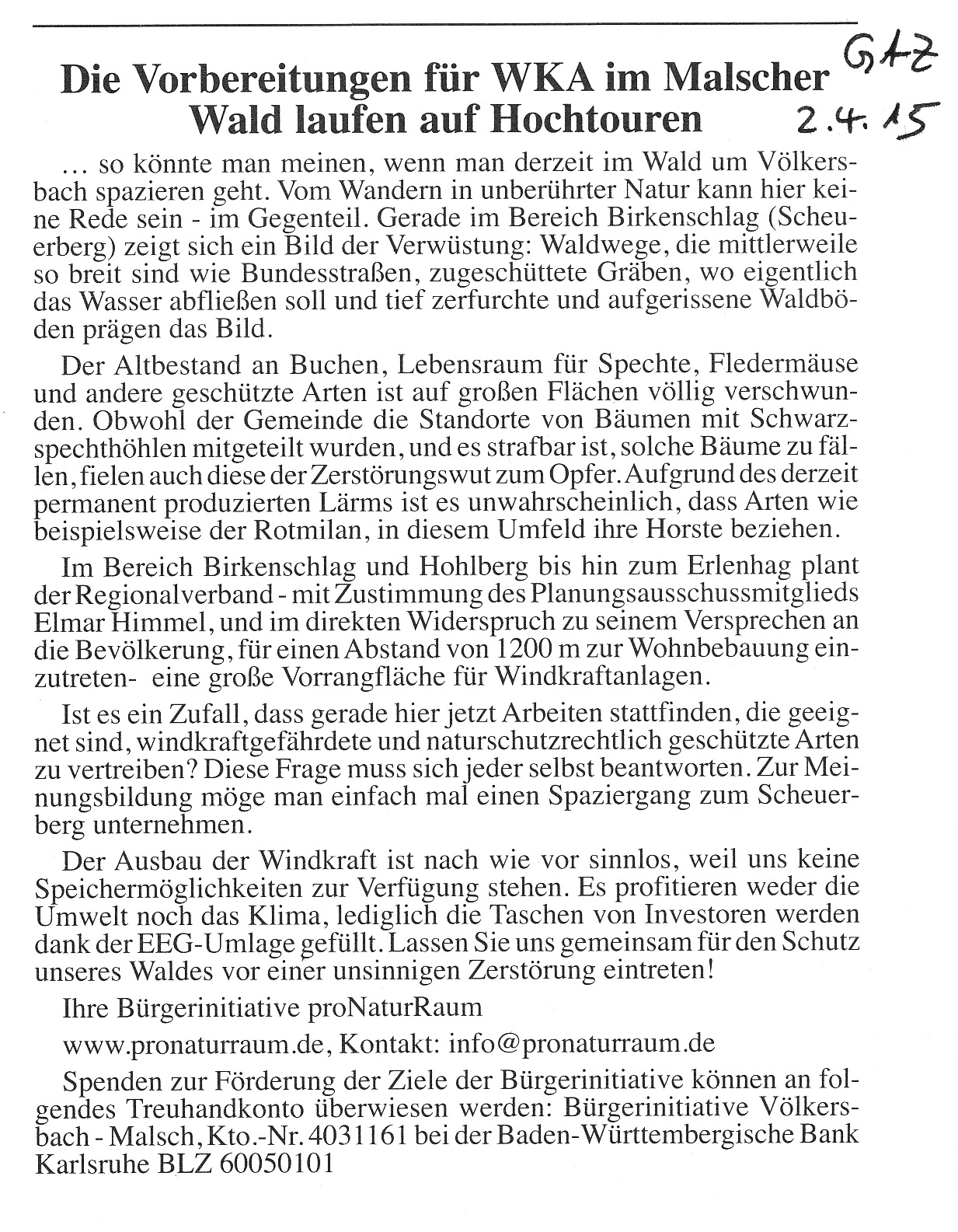 Ihre Bürgerinitiativen proNaturRaum Völkersbach/Malsch/Sulzbach, Gegenwind Ettlingen e.V. und Runder Tisch Windkraft-Freiolsheim